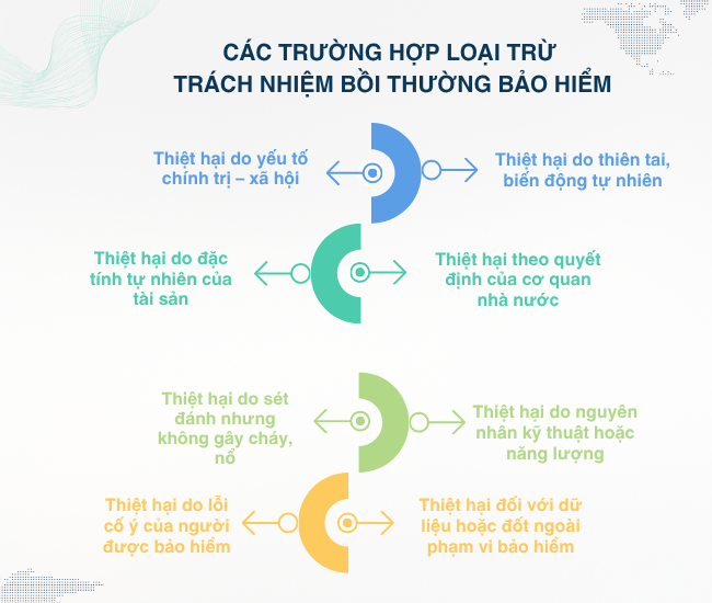 Doanh nghiệp bảo hiểm không bồi thường đối với thiệt hại phát sinh từ các biến cố về chính trị, an ninh, trật tự an toàn xã hội, chẳng hạn như bạo loạn, khủng bố, chiến tranh hoặc biểu tình quy mô lớn.